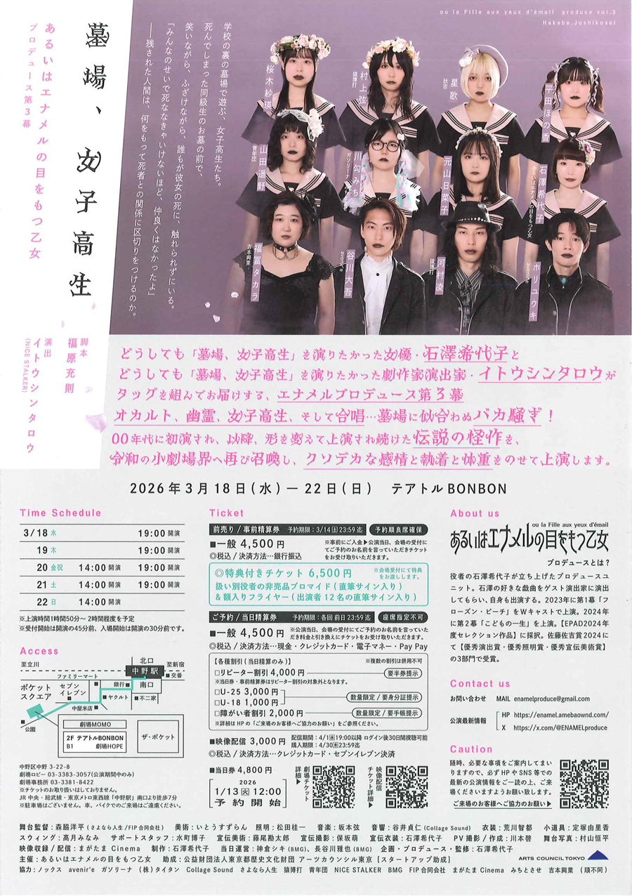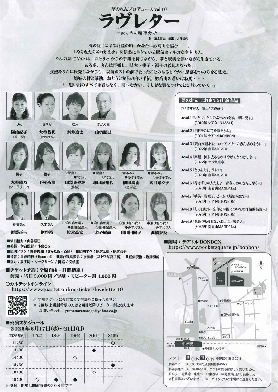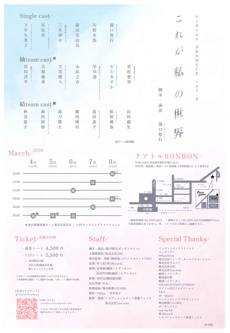 特典付きチケット ※会場受付にて特典をお渡しいたします。 扱い別役者の非売品ブロマイド(直筆サイン入り)&額入りフライヤー(出演者12名の直筆サイン入り) リピーター割引 要半券提示 ※当日券・事前精算券はリピーター割引の対象外となります。 U-25 数量限定/要身分証提示 U-18 数量限定/要身分証提示 障がい者割引 数量限定/要手帳提示 |